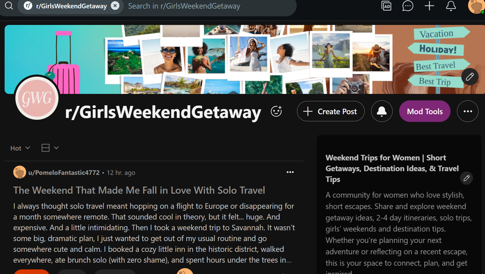 If you love weekend trips, girls’ getaways, solo escapes, or short-but-sweet adventures, this is your new happy place. In our GirlsWeekendGetaway Reddit group, you’ll find:
